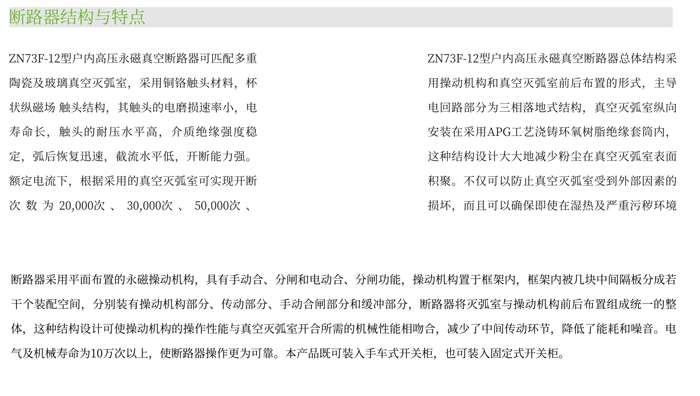 ZN73F-12型真空斷路器適用于以空氣為絕緣的戶內(nèi)式開(kāi)關(guān)系統(tǒng)中。在正常的使用條件及斷路器的技術(shù)參數(shù)范圍內(nèi),ZN73F-12型真空斷